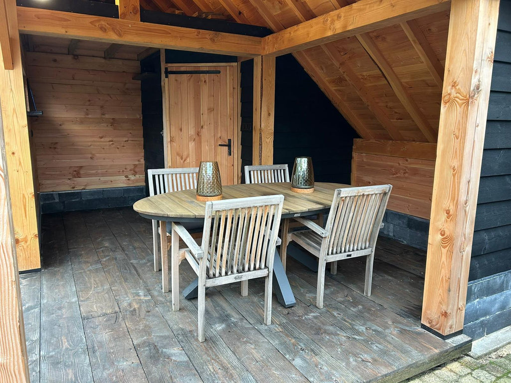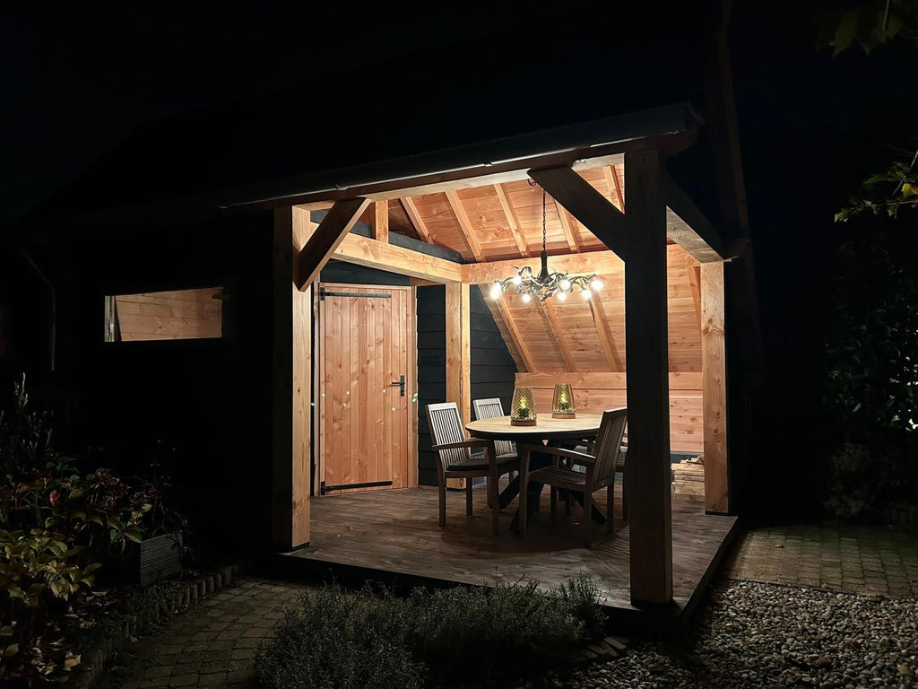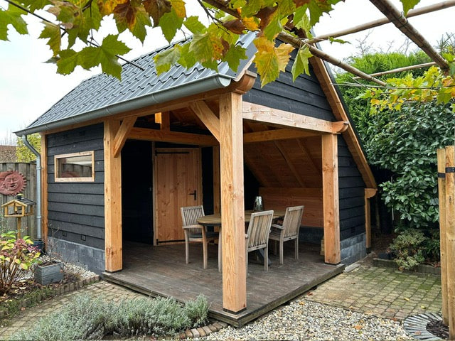Discover the Sofia, a masterpiece in classic timber construction, available in different sizes from 15.75 to 24 m². This wooden frame, characterized by its characteristic barn roof that is low on one side, combines oversized beams  of 18 x 18 cm and traditional wood joints for a robust and timeless appearance. The Sofia is the ideal solution for those who need a terrace, storage room, workspace or office. With its flexible layout, divided into two parts by support beams, this building effortlessly offers space for two different applications.
