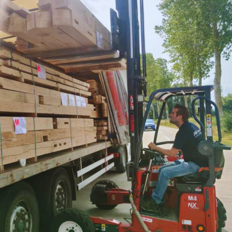 Uw houtbouwpakket wordt geleverd met een vrachtwagen die is uitgerust met een kooiaap, een mobiele heftruck, om de levering zo soepel en efficiënt mogelijk te laten verlopen. Dit stelt ons in staat om uw pakket, indien de omstandigheden het toelaten, direct op de gewenste locatie te plaatsen.